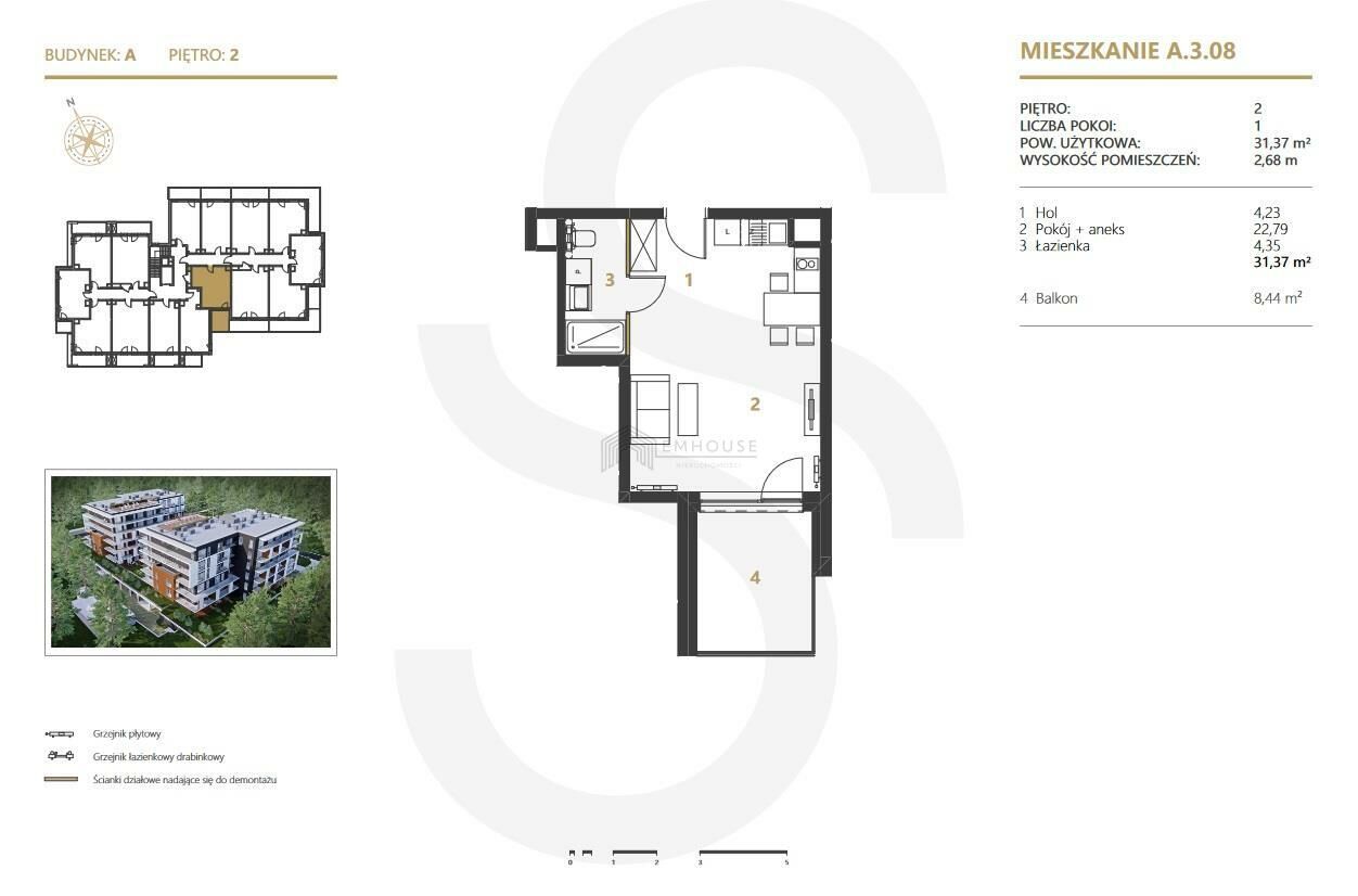 APARTAMENTY W MIĘDZYZDROJACH - NIERUCHOMOŚĆ PO ODBIORACH I WOLNA OD OBCIĄŻEŃ !Przedstawiamy Państwu jednopokojowe mieszkanie z balkonem A.3.08 o pow. 31,37 m, położone na drugim piętrze nowoczesnego apartamentowca inwestycji Sand and Sky Apartments w miejscowości Międzyzdroje.